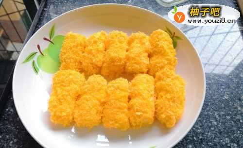4之后将冷藏好的鲜奶拿出,切成小条,打上一个鸡蛋打散,将鲜奶条裹上蛋液后再均匀地裹上面包糠。