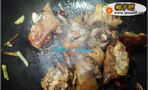 6倒入前面沥干的猪脚,翻炒一会,然后加入各种调味料,翻炒均匀,加入适量的水。
