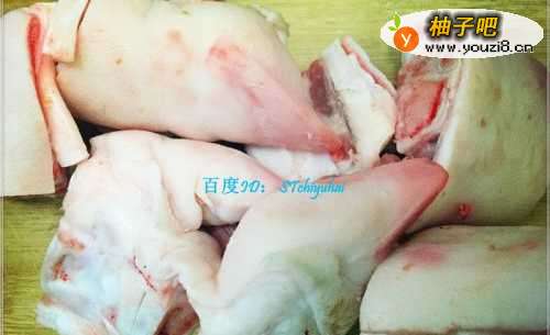 准备一截猪脚,选择猪手那段,那段肉比较少,不过肉的味道有弹性,有较多筋,酱出来有嚼劲,很是不错。让卖肉师傅帮忙处理一下,刮干净然后切成小块状,带回来过水清洗几遍。