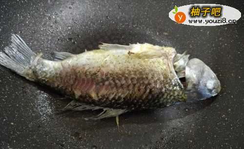 2鲫鱼去掉腹部的黑膜,清洗干净,用纸巾擦干水分,放入锅里煎至微黄。这里我用的是不粘锅,如果是一般的铁锅,先将锅烧热,用姜擦拭一下锅底(目的是防粘,煎鱼不破皮),再倒入少许食用油,烧热后放鲫鱼再煎。