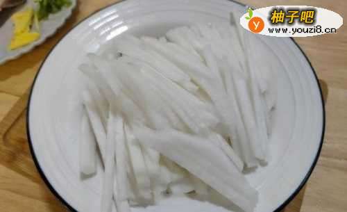 4炖汤的时间我们将萝卜处理一下,削皮洗净切细丝