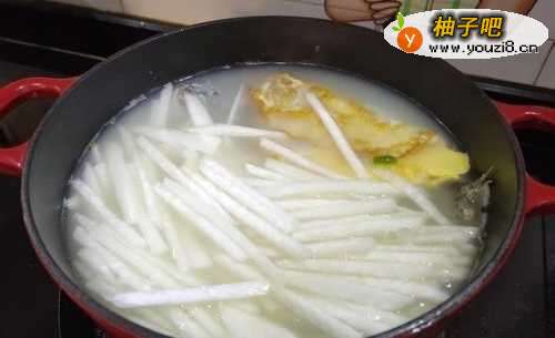 5鱼汤奶白,这时放入萝卜丝,保持锅里沸腾的状态,再煮8~10分钟,萝卜丝变软变透就可以了。