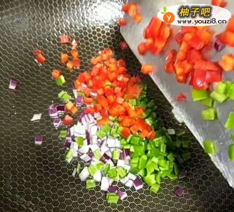 3锅留底油,放入盐,洋葱丁,青红椒丁,耗油;