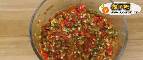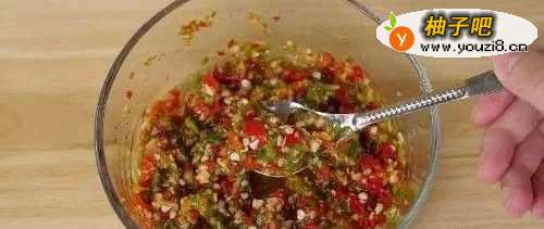 5炸出香味,捞出料渣,再把油分3次浇到辣椒里面,再搅拌一下!