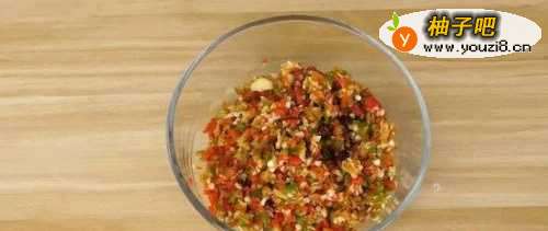 3然后加入一勺的盐,一勺白糖,一勺高度白酒!搅拌均匀,加入白酒的作用是可以起到杀菌消毒,加快辣椒酱发酵,增加辣椒酱香味的作用!