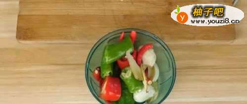 2接着把大蒜去皮,拍一拍!生姜切片!然后把晾干的青红辣椒,大蒜,生姜一起放进搅拌机!把它打碎!