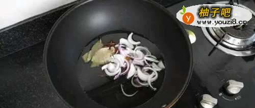 4锅内烧油,放入洋葱,八角,桂皮,香叶!开小火慢炸!