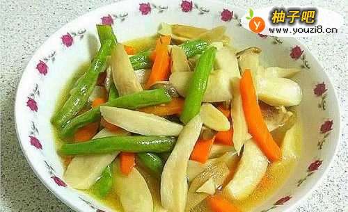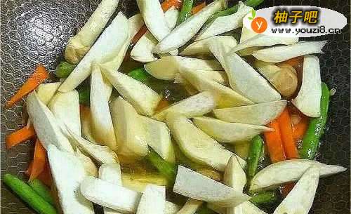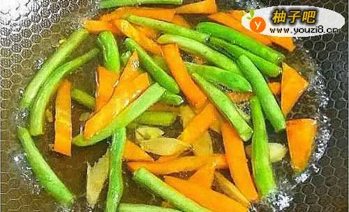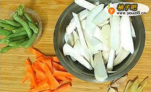 将杏鲍菇斜切成片,红萝卜切成跟杏鲍菇差不多大小,芸豆洗净切成小段。