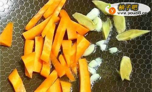 2锅内放一点油,姜、红萝卜和蒜一起下锅,炒出香味。