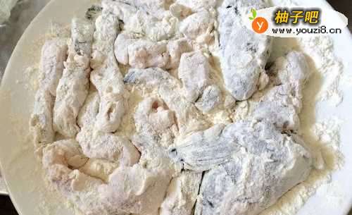 2接着在干净无水的盘子里再倒50克面粉,把鱼块再裹一次面粉!