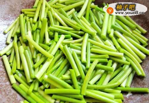 22,将蒜苔切成4cm长均匀小段,用水洗净装盘备用。