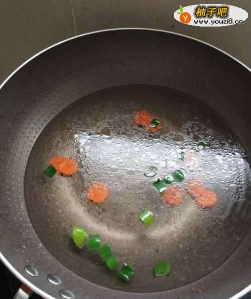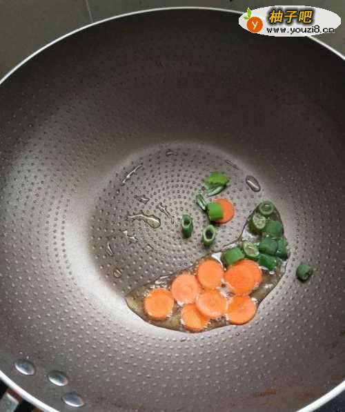 2如图,锅内加入适量色拉油烧至八成热后放入胡萝卜、大葱,翻炒几下。