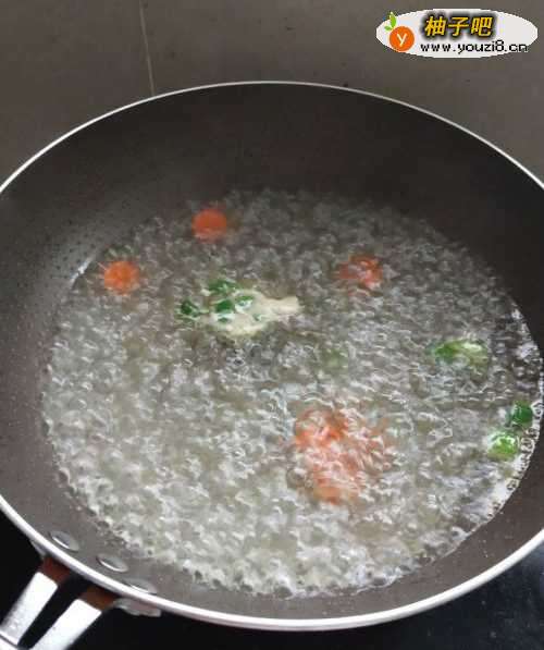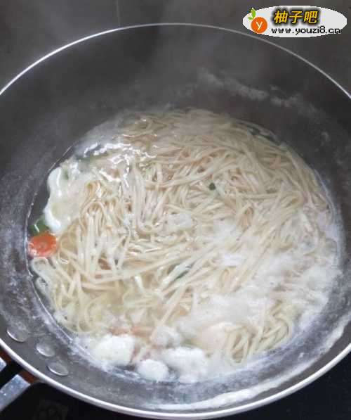 6如图,待鸡蛋八成熟时放入适量挂面,并不停搅拌,煮两分钟后放入适量鸡精,然后关火。