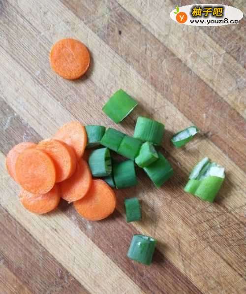 如图,首先把胡萝卜、大葱洗净后切好备用。