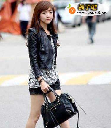 1金属拉链的修饰令皮外套更加闪亮和帅气,高跟靴子的搭配以及米字国旗的包包表达出时尚的味道。