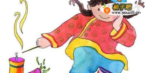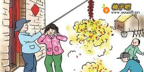 3孩子们放长鞭炮时,将长鞭炮挂在竹棍上,但这个竹棍不能太长,孩子用手平举着,不能举太高,以免鞭炮的碎末飞到头发上。