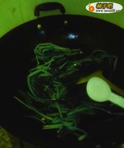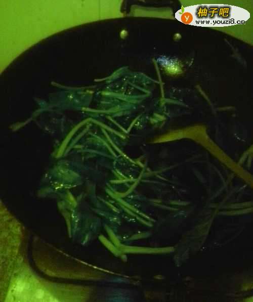 3把锅烧的很热的时候,放油,然后放波菜,如下图所示。