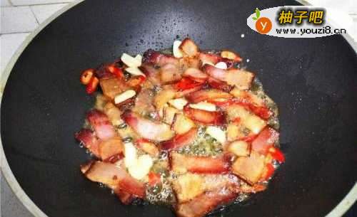 6下入腊肉小火煎至两面金黄,也就是煎出多余的油来,不可煎得太干