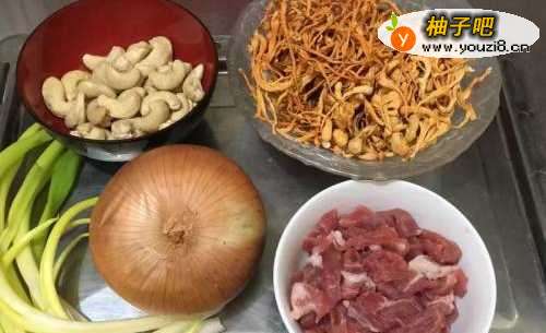 2虫草花洗干净,可加入少许水浸泡10分钟;洋葱去头尾,去皮,切粗丝;葱切段,葱白葱尾分开放;生腰果洗净