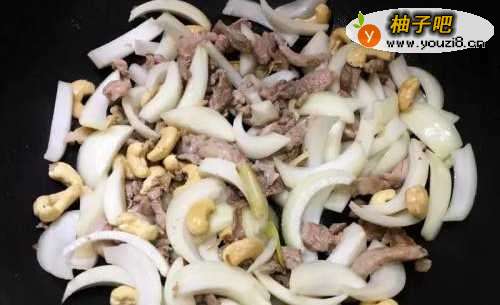 4随后加入洋葱和生腰果炒香