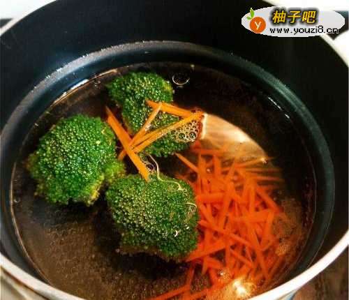 先煲一锅热水,加入少许盐,放入西兰花焯30秒和红萝卜丝焯至软身。并隔水放凉。