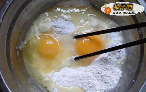 3将250G面粉装进盆里,2个鸡蛋打入,加些许清水。