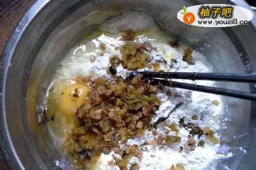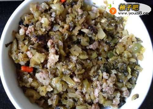 4在加入炒好的酸菜肉末,一起搅拌均匀。