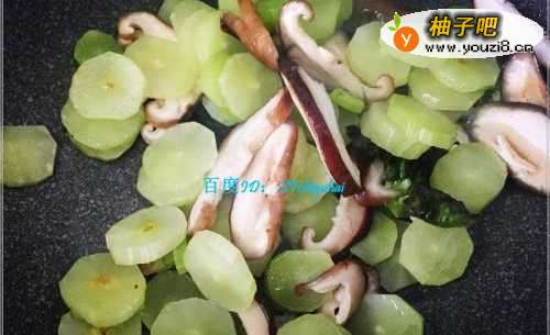 5先加入莴笋茎以及香菇片,大火混炒一阵,准备少许温开水,如果锅过热,加入少许。