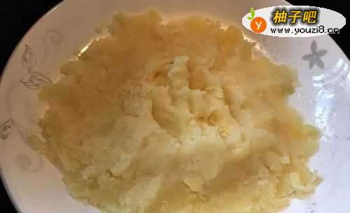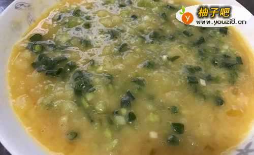 5将鸡蛋液放入土豆泥中,加入葱花、少许盐,一起搅拌均匀。