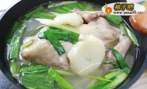 4闷煮约20分钟至鸡肉快熟,放入蒜段。