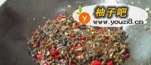 6倒入梅干菜,放入盐、五香粉、生抽一汤匙、料酒两汤匙,炒均匀小火收干汁备用。