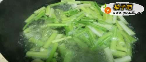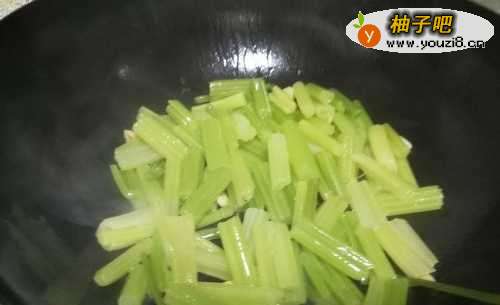 3起锅烧油放蒜末爆香,加入芹菜翻炒一下。