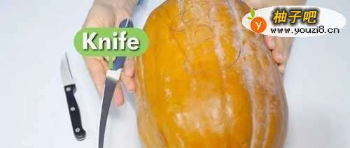 2准备好刀(见图)在南瓜上方切下一个圆,不要太小,当然也不能太大。