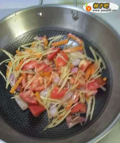5加入嫩姜丝,继续翻炒至所有蔬菜均表面微微发蔫。