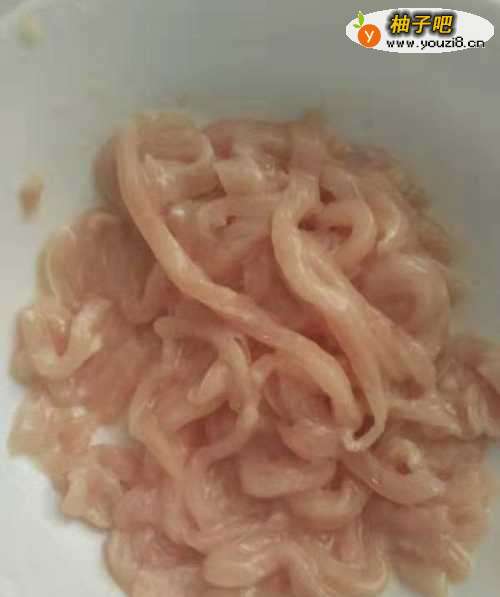 3将鸡胸肉切成细丝,用淀粉抓均匀后,热油下锅煸炒至变色后,捞出备用。