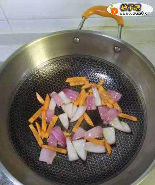 4锅内加入少许油,烧热后加入紫色洋葱、胡萝卜块,翻炒出香味。