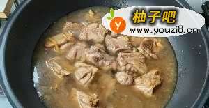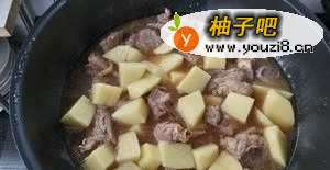 6当排骨炖好时,把土豆块沥水倒入锅内,再加入一点清水没过排骨跟土豆块。