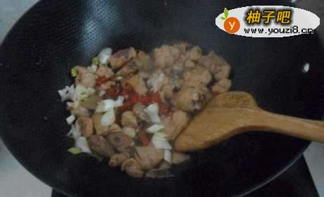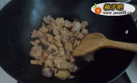 4锅中放油,放入鸡块煸炒出香味。