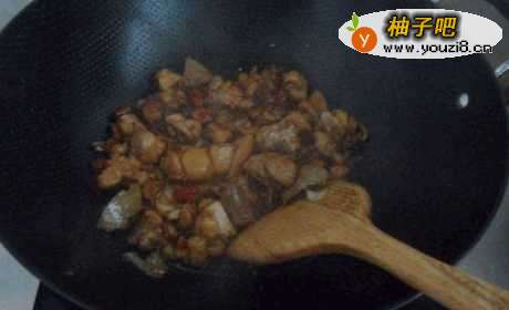 6放入料酒、酱油,将鸡块的水分炒干。