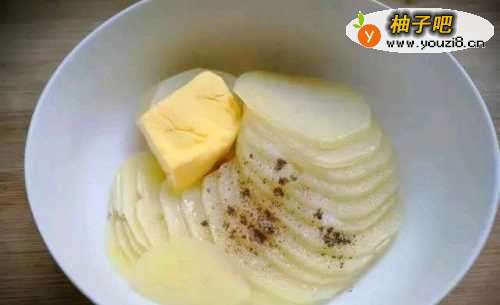 4把土豆取出倒入碗中,趁热加入少量胡椒,盐,黄油,(食盐换成糖,做成甜口的,也不错)。见下图