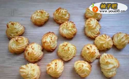6装入裱花袋中。挤在铺好油纸的烤盘上,挤出花形。见下图