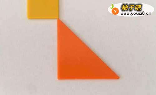 2挨着正方形右下角摆放一块大三角形,大三角形左上角与正方形右下角相接,大三角形长边朝右上。