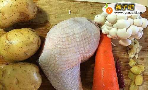 鸡腿、马铃薯、红萝卜、洋葱切块,姜切片,蒜头切末,白玉菇冲一下水拨开备用。