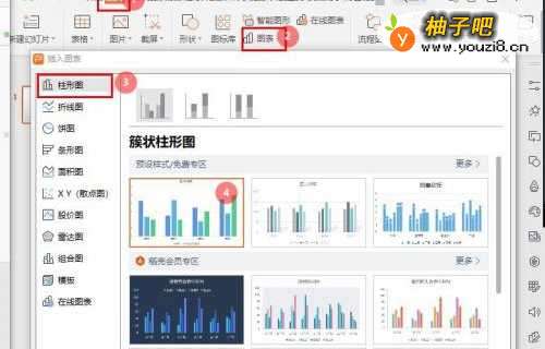 2点击【插入】—【图表】,选择【柱形图】—【簇状柱形图】,点击【插入】;