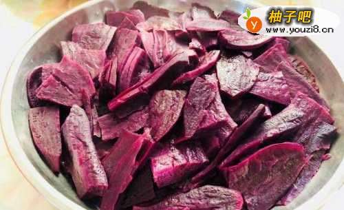 紫薯去皮切片蒸熟,大概蒸20分钟能熟。