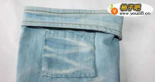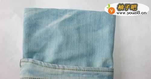 首先如图将旧牛仔裤的裤腿最下面一块裁剪下来。