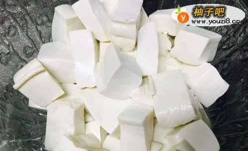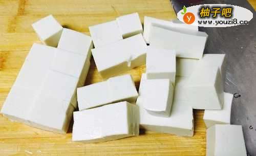 首先把豆腐切成正方形的块状,然后与冷水一起下锅,放入少量盐开大火煮开,此步骤是为了去除豆腐的豆腥味。
