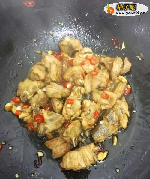 5另起一锅,油热放入腌制好的排骨,炒至变色,将腌制排骨的朝天椒、蒜头加入一起翻炒;