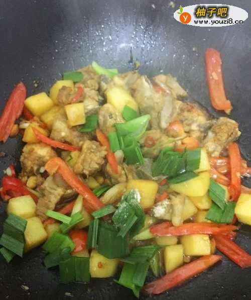 6按顺序,分别加入大红椒,土豆丁翻炒,翻炒至红椒熟了,加入用水稀释的腌制排骨酱料,盖上锅盖,小火焖5-10分钟;