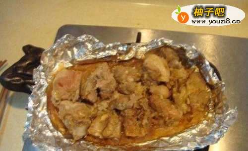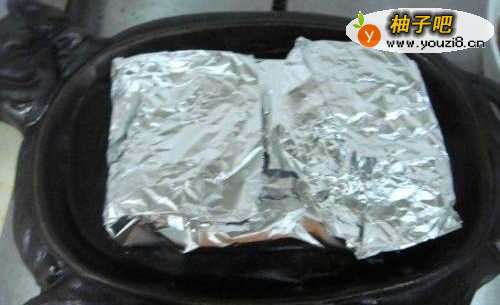 7把铁板盖子盖上,中火煎烤10分钟左右打开,把排骨翻个面再包好